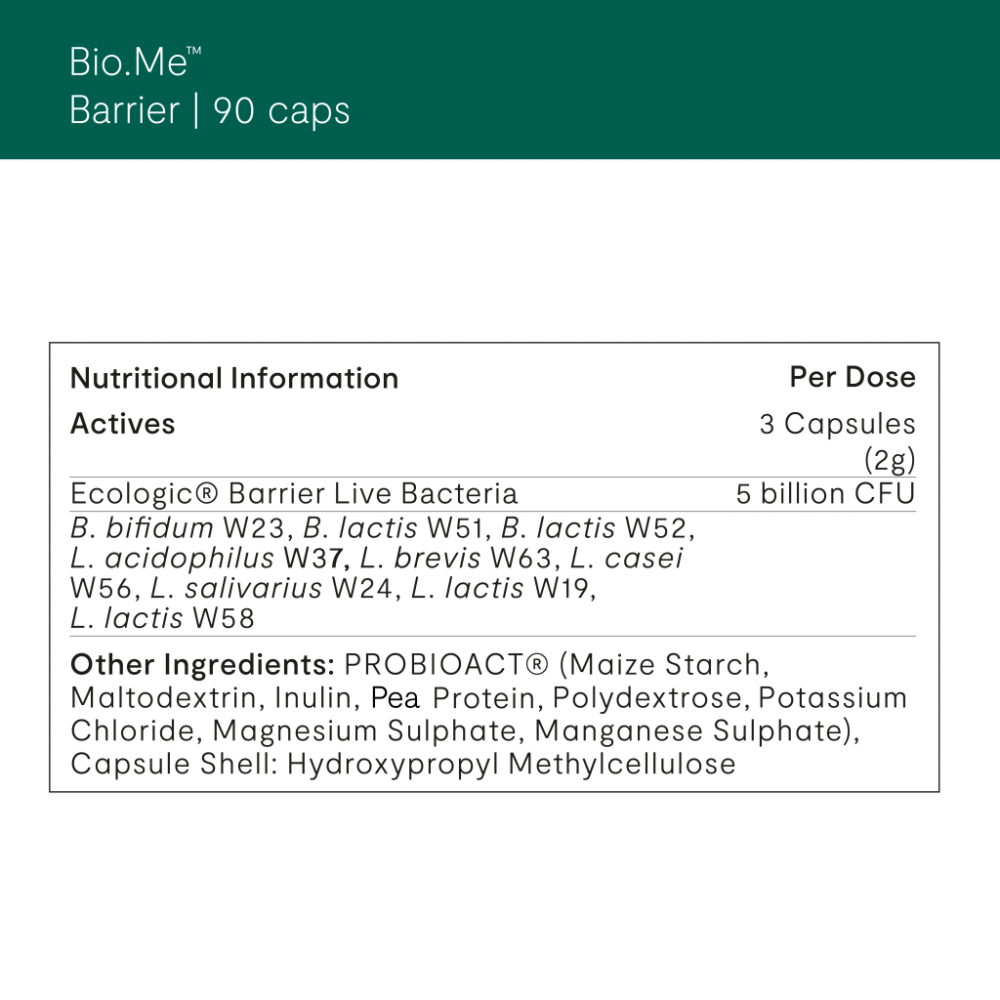 Ecologic® Barrier Live Cultures 5 billion CFU Bifidobacterium bifidum W23, Bifidobacterium lactis W51, Bifidobacterium lactis W52, Lactobacillus acidophilus W37, Lactobacillus brevis W63, Lactobacillus casei W56, Lactobacillus salivarius W24, Lactococcus lactis W19, Lactococcus lactis W58