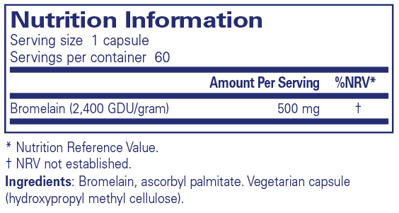 Bromelain 2400 features high potency bromelain of 2400 GDU per gram. GDU’s (gelatin dissolving units) are a measure of the activity of bromelain and ensure strength. Each vegetarian capsule provides 500 mg of professional strength bromelain. Bromelain is a proteolytic enzyme.