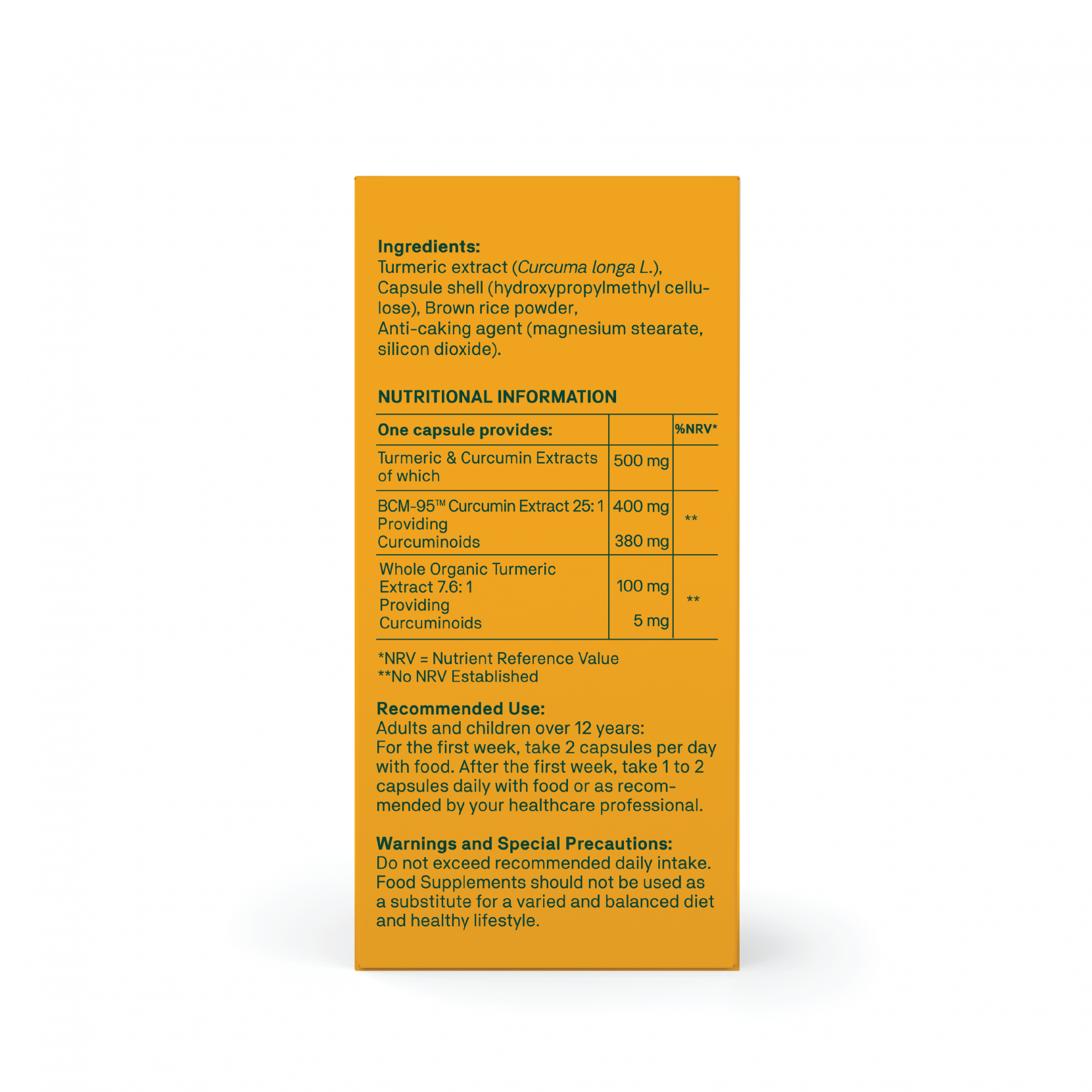 Turmeric extract (Curcuma longa L.), Capsule Shell (hydroxypropylmethyl cellulose), Brown rice powder, Anti-caking agent (magnesium stearate, silicon dioxide)