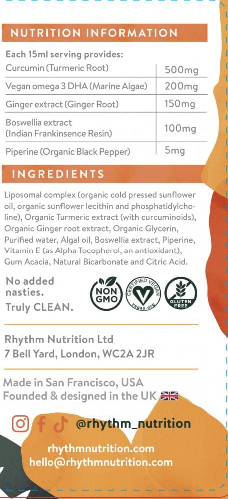 Liposomal complex (organic cold pressed sunflower oil, organic sunflower lecithin and phosphatidylcholine), Organic Turmeric extract (with curcuminoids), Organic Ginger root extract, Organic Glycerin, Purified water, Vegan Omega 3 Algal oil, Boswellia extract, Piperine, Vitamin E (as Alpha Tocopherol, an antioxidant), Gum Acacia, Natural Bicarbonate and Citric Acid