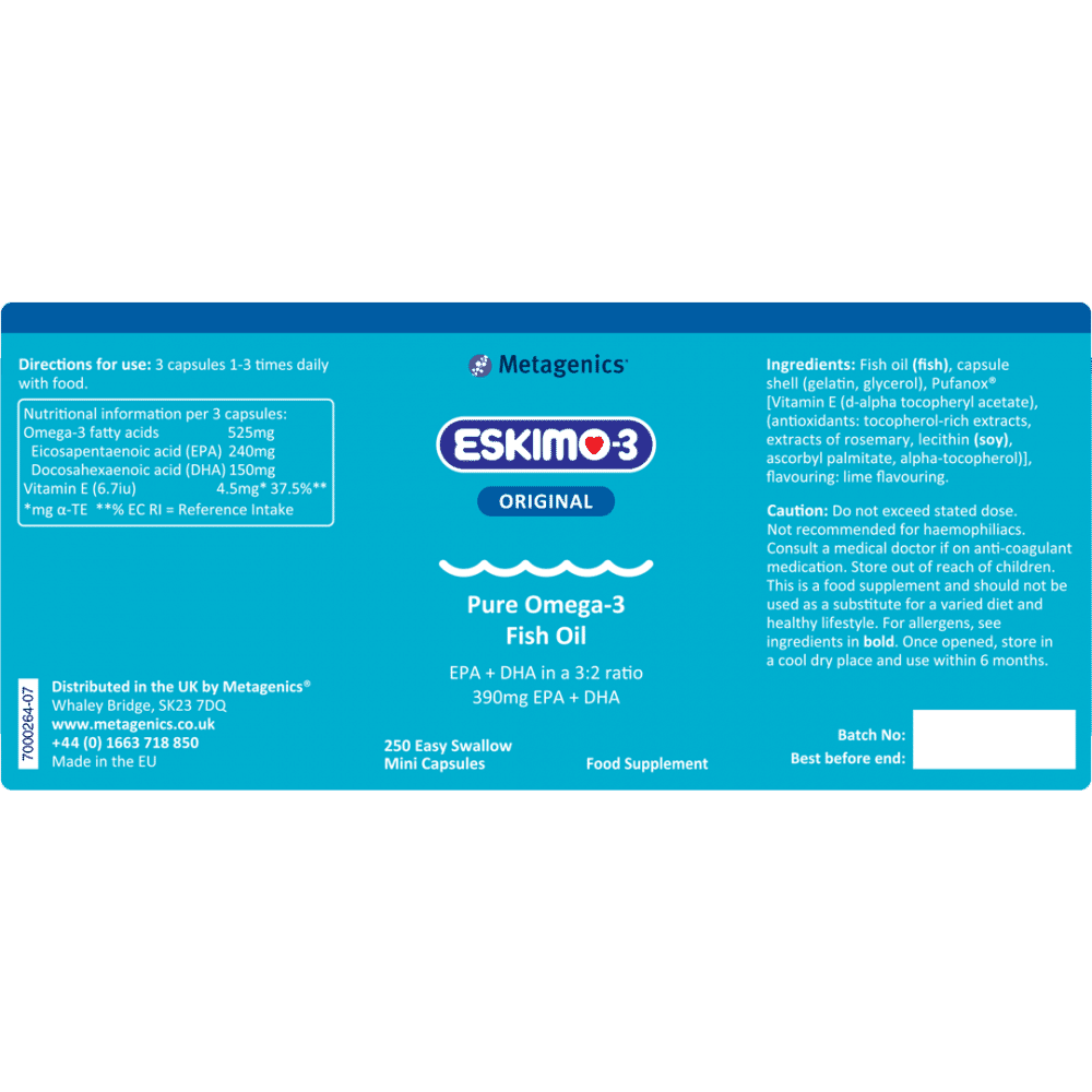 Natural fish oil (fish), capsule shell (gelatin, glycerol), Pufanox [Vitamin E (d-alpha tocopherol acetate), (antioxidants: tocopherol-rich extracts, extracts of rosemary, lecithin (soy), ascorbyl palmitate, alpha tocopherol)], flavouring: lime flavouring.