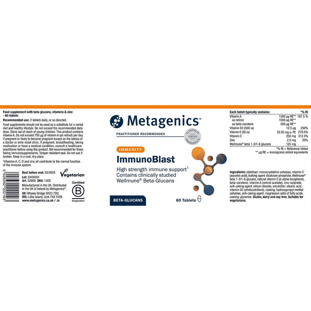 ImmunoBlast is expertly formulated to strengthen and support the immune system using clinically proven ingredients. It combines patented Wellmune® Beta Glucans with essential nutrients including vitamins A, C, D, E and zinc, to support the body's natural immune defences.