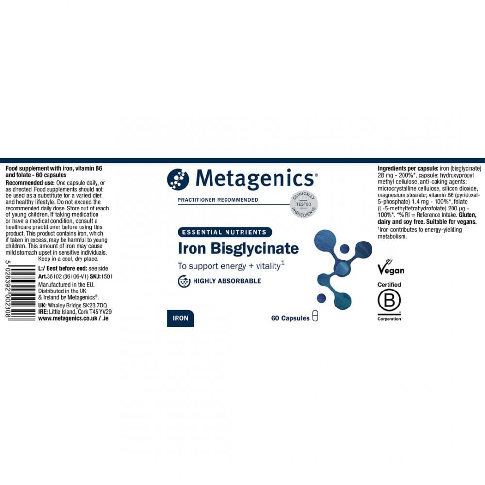 Provides iron as highly absorbable iron bisglycinate, well tolerated by sensitive digestion. Includes active folate (5-MTHF) and vitamin B6 (P-5-P) supporting red blood cell formation, normal energy, reduced fatigue, and homocysteine metabolism, aiding cardiovascular and cognitive health.
