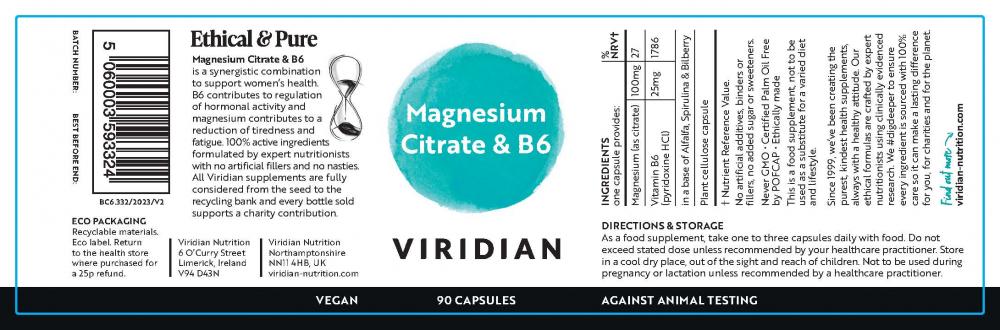 Magnesium (Citrate), Vitamin B6 (Pyridoxine HCl), in a base of alfalfa, spirulina and bilberry, plant cellulose capsule
