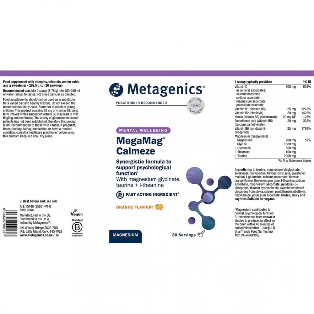MegaMag® Calmeze has been carefully formulated to support normal psychological function, a healthy nervous system and to aid reduction of tiredness and fatigue by providing a high strength combination of magnesium in its glycinate form, B vitamins, l-theanine, taurine, glutamine and vitamin C.