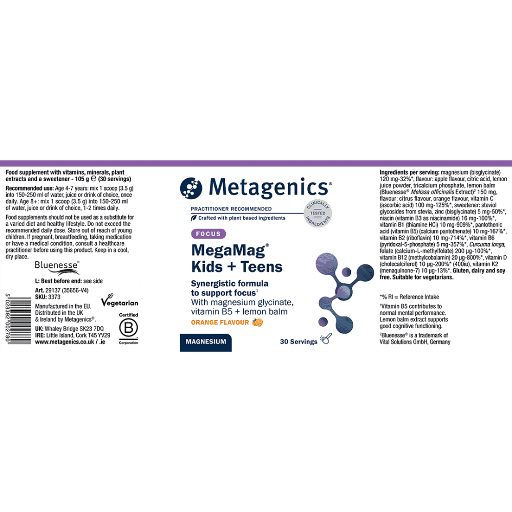 Dual-action magnesium glycinate and clinically studied Bluenesse® lemon balm in a delicious natural orange flavoured powder with a range of B vitamins for cognitive function, concentration and emotional balance. Ideal for active and growing children.