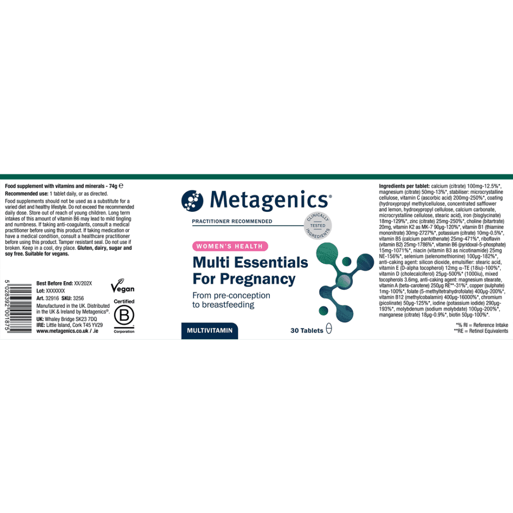 Multi Essentials for Pregnancy provides 25 essential vitamins and minerals developed specifically for pre-conception, pregnancy and breastfeeding. Including a wide range of nutrients to support everyday health, it also includes key ingredients such as iron, body-ready folic acid and iodine.