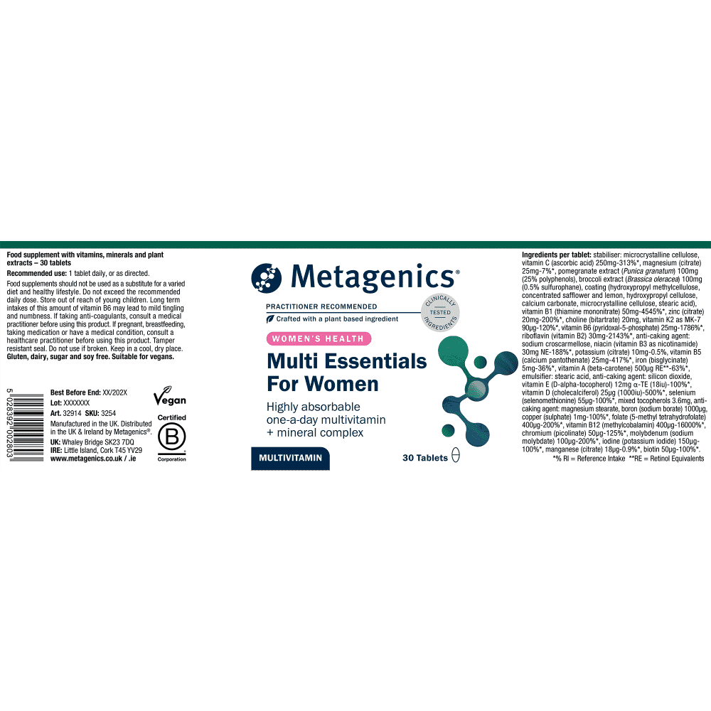 Multi Essentials For Women is a premium multivitamin and mineral formula for female health - providing extra iodine and selenium for thyroid and antioxidant support; boron for bone health; and broccoli and pomegranate extracts for hormone health, antioxidants and skin health.