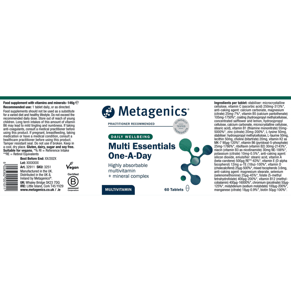 Stabiliser: microcrystalline cellulose, ascorbic acid, anti-caking agent: calcium carbonate, magnesium citrate, calcium pantothenate, coating (hydroxypropyl methylcellulose, hydroxypropyl cellulose, natural safflower and lemon, calcium carbonate, microcrystalline cellulose, stearic acid), menaquinone-7, thiamine mononitrate, zinc citrate, l-lysine, stabiliser: hydroxypropyl methylcellulose, l-taurine, lecithin, choline bitartrate, pyridoxal-5-phosphate, riboflavin, nicotinamide, potassium citrate, emulsifier: stearic acid, anti-caking agent: silicon dioxide, beta-carotene, d-alpha tocopherol, cholecalciferol, mixed tocopherols, anti-caking agent: magnesium stearate, selenomethionine, 5-methyl tetrahydrofolate, methylcobalamin, chromium picolinate, sodium molybdate, manganese citrate, biotin