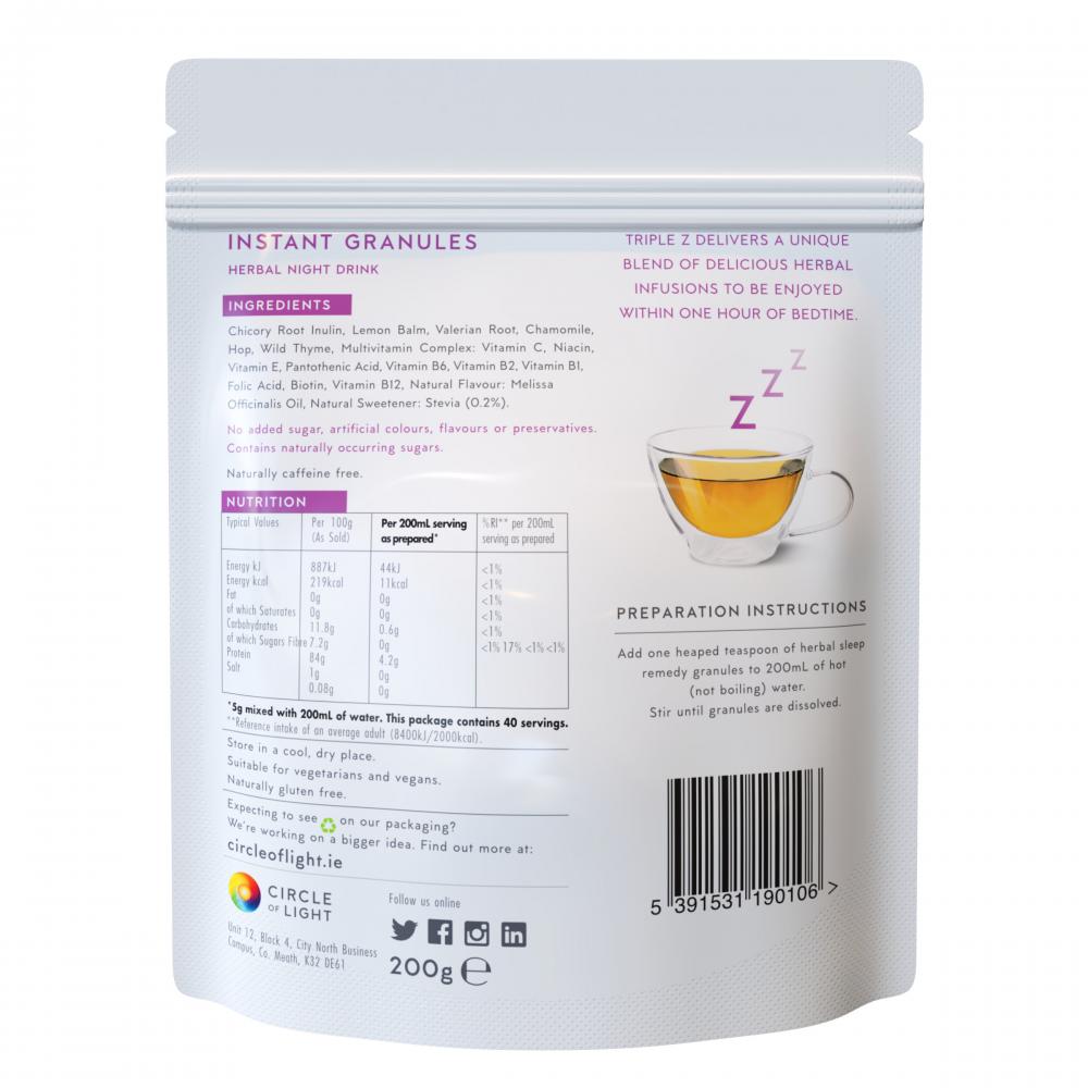 A delicious herbal night drink made from 100% natural ingredients. Triple Z is a unique blend of multi-vitamins, inulin (soluble fibre) and soothing herbs from Nature’s cupboard: lemon balm, valerian (0.125g per 5g serving), chamomile, hop and wild thyme, that work together to soothe and relax.