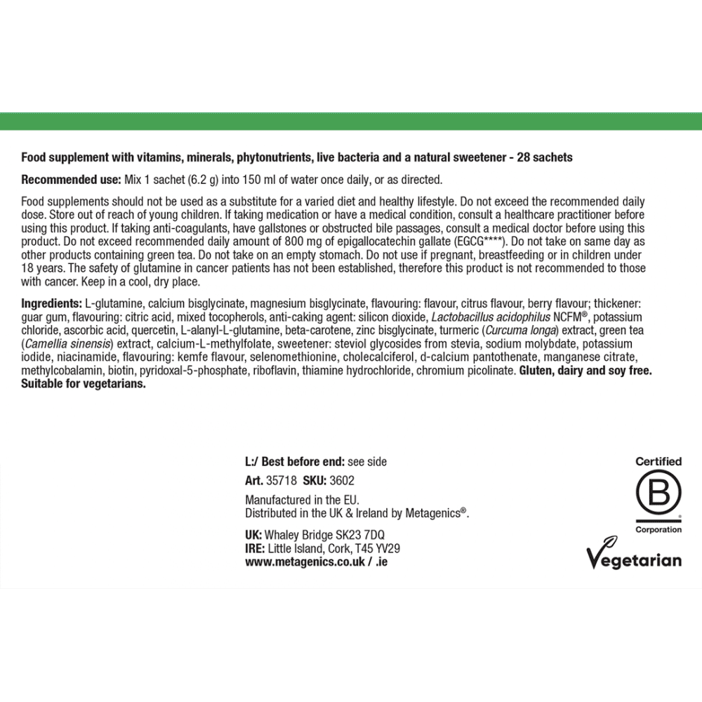 A science-based formula with glutamine, zinc bisglycinate, quercetin, turmeric, alpha lipoic acid, green tea, and Lactobacillus acidophilus NCFM®. Ideal for use in gut restoration protocols or during times of increased digestive stress to support gut lining, immune health, and antioxidant defence.