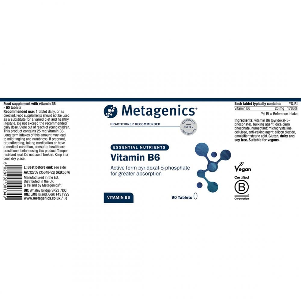 Vitamin B6 presented in its most biologically active form, pyridoxal-5-phosphate. Vitamin B6 is essential for over 160 vital enzyme processes in our body, including energy production, the regulation of hormonal activity, methylation and proper nervous system function.