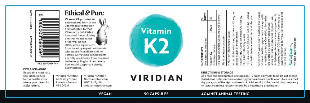 Vitamin K2 provides an easily utilised form of this vitamin in a vegan, non animal tested format. Vitamin K contributes to normal blood clotting and the maintenance of normal bones.